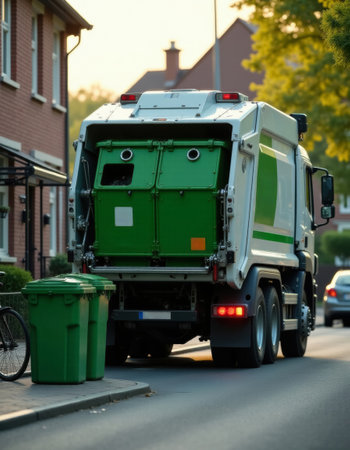 A green garbage truck at sunrise, silhouetted by the warm light as it loads waste bins on a quiet country road