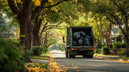 A garbage truck drives down a residential street surrounded by trees. It collects black rubbish bags from homes as part of sanitation services in the area.