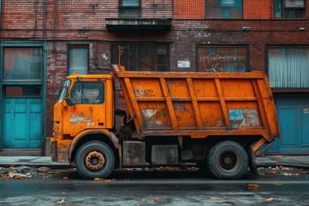 A muddy garbage truck collecting waste in a rainy city environment, symbolizing urban sanitation and industrial service.