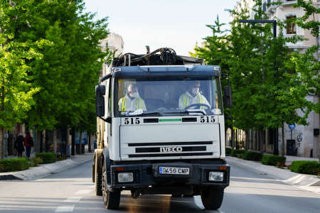 GRANADA, SPAIN, 23RD APRIL, 2020 Garbage truck driving on the empty street