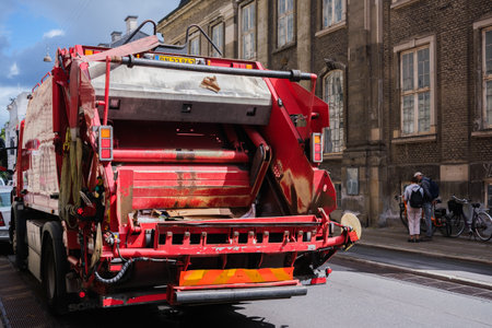 Copenhagen, Denmark - August 8, 2023: Garbage truck, with automatic container removal and emptying system.