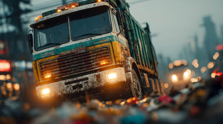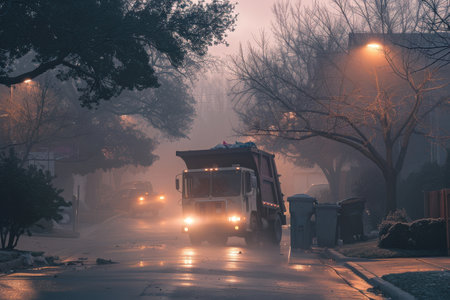 Garbage truck collecting trash on a misty street at dawn, illuminated by streetlights, showcasing urban morning routine and sanitation efforts