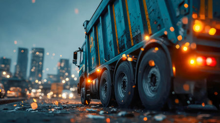 Powerful garbage truck illuminated in city lights as it operates on wet urban street at dusk.