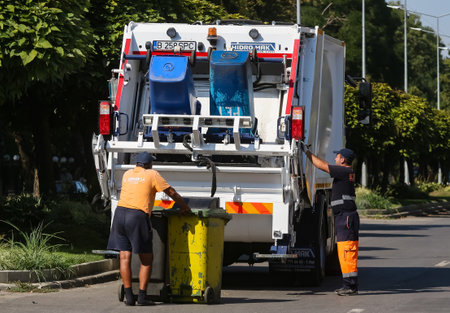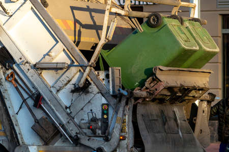 garbage and waste removal services. Worker loading waste bin into truck at city