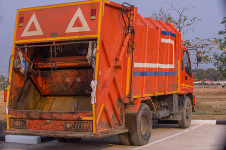 Industrial garbage truck with hydraulic under blue sky. Rear and side view. Nobody. garbage truck in Thailand.