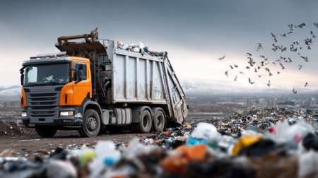 This image depicts a garbage truck loading waste at a landfill site, with birds soaring above under a dramatic cloudy sky, emphasizing environmental challenges.