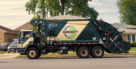 Chicago, Illinois, USA - August 21, 2024: Garbage truck of Groot industries. Waste management industry. Sorting and recycling concept. Garbage collection service. Waste collection truck