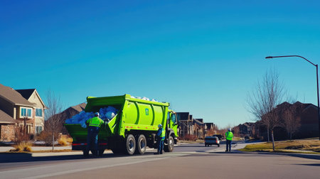 A bright green garbage truck parked on a suburban street, workers loading waste bags into the rear, under a clear blue sky
