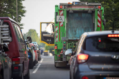 Huerth, NRW, Germany, 06 09 2021, Garbage trucks are blocking the passage in a street, cars are waiting behind it