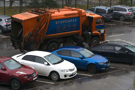 MOSCOW, RUSSIA-October 22, 2021: A city car that takes recyclables to the place of waste processing. It says recyclables in big letters