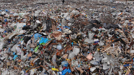 A vast landfill site full of various types of waste, including plastic, clothing, and other debris, highlights pollution and ecological issues.
