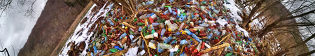 wild garbage dump. residual glass, plastics in the forest