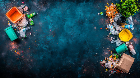 Pile of garbage waste on dark blue background. Top view.