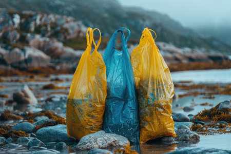 Impactful image depicting illegal dumping with plastic bags abandoned in nature, showing the environmental crisis of irresponsible waste disposal
