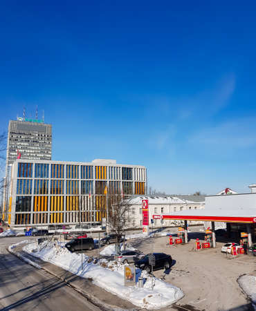 LATVIA, RIGA, FEBRUARY, 2021 - Urban infrastructure with a petrol station in the background of modern buildings in the Citadel area, Riga, Latvia