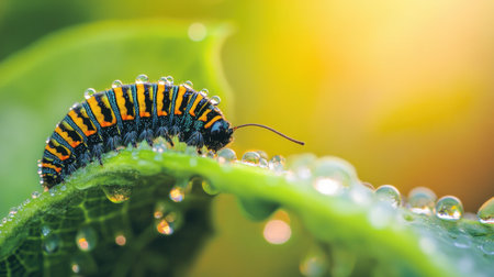 A colorful caterpillar rests on a leaf adorned with dew drops, showcasing nature's beauty and intricate details. Perfect for nature enthusiasts.