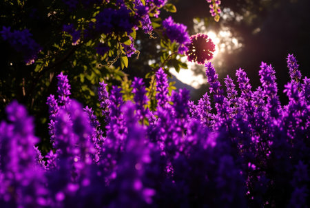 Clusters of delicate purple flowers flourish in a vibrant garden, basking in warm sun rays.