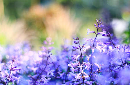 Close up of purple decorative sage flowers field. Beautiful summer garden violet floral bloom background. Salvia Bumbleberry, Woodland Sage. Selective focus.