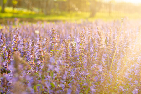 Vibrant purple flowers bloom abundantly in a garden, basking under the warm late spring sun.