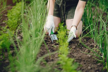 Gardeners hands planting and picking vegetable from backyard garden. Gardener in gloves prepares the soil for seedling. Season work.