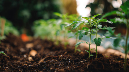 Young tomato seedlings emerge from dark, fertile soil, symbolizing new beginnings in agriculture. The lush garden environment enhances the growth process.