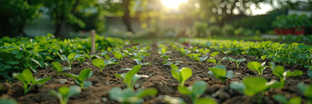 Garden filled with lots of dirt and green plants growing in the dirt. Generative AI.