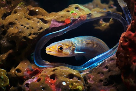A mysterious eel peeking out from its rocky hideout, its body winding sinuously through the coral as it surveys the underwater landscape