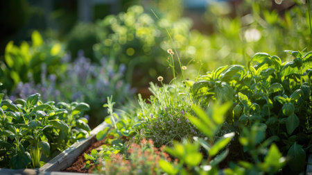 close-up of vibrant and lush garden, with the sun shining through, created with generative ai