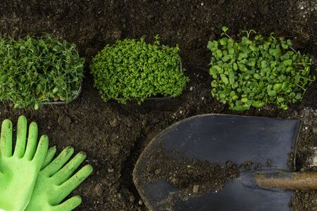 microgreens seedlings in soil with gardening green gloves, shovel. Healthy organic food concept