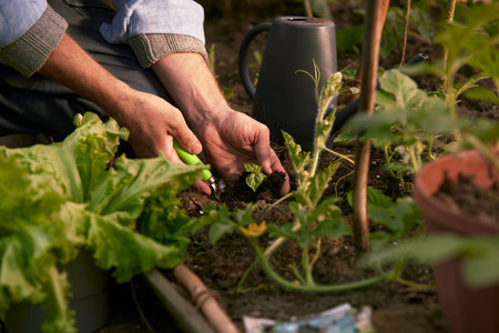 Stock photo of two hands cultivating plants in the garden during sunny day. Gardening concept.