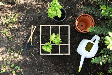 top view on vegetable seedlings and aromatic plant on the soil to be planted in a garden