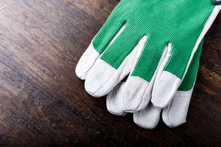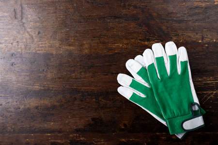 Clean work gloves on dark brown wooden background. space for text