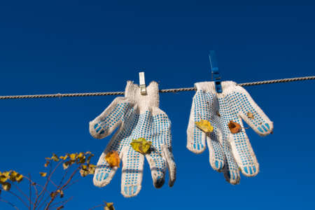 A pair of white work gloves, fastened with two clothespins, with blue pimples and leaves stuck after work, hanging from clothesline against the blue sky and yellow dry dead leaves on the top of tree