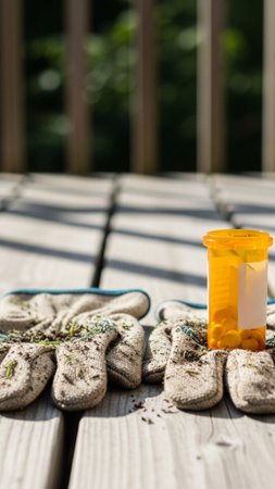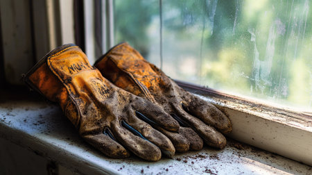 Gloves soaked in sweat and dirt, sitting on a sunlit windowsill, telling a story of effort