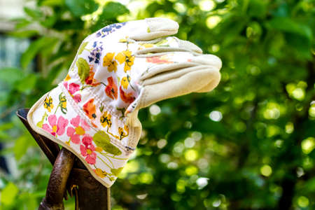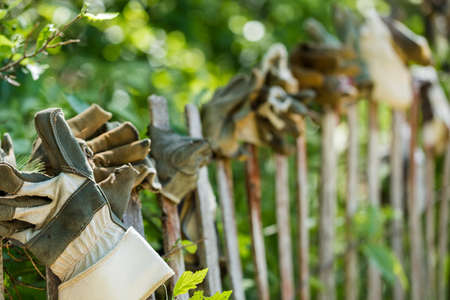Close up of brightly colored gardening glove sitting on fence