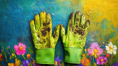 A captivating scene featuring dirty green gardening gloves resting on a bright, vibrant floral background, showcasing the beauty of nature and creativity.