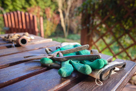 Old garden scissors and gloves lying on a wooden table