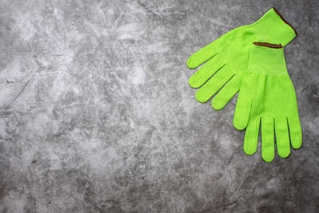 Green work gloves on gray background. Top view, with copy space.