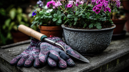 A close-up display of colorful gardening gloves and a trowel rests beside vibrant flower pots, showcasing the beauty of nature and gardening tools in an outdoor setting.