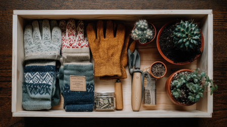 This stock photo captures the essentials for gardening, featuring colorful gloves, tools, and vibrant potted plants neatly arranged in a wooden tray, perfect for spring activities.