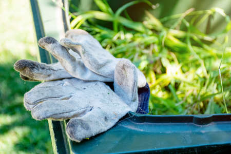 Green bin container filled with garden waste. Dirty gardening gloves. Spring clean up in the garden. Recycling garbage for a better environment