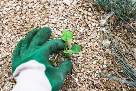 weeds removed by hand wearing gardening gloves, concept of gardening and taking care of your backyard