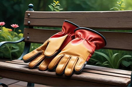 A pair of yellow and red gardening gloves lay on a wooden bench in a lush park setting, with colorful flowers blooming nearby under bright sunlight.