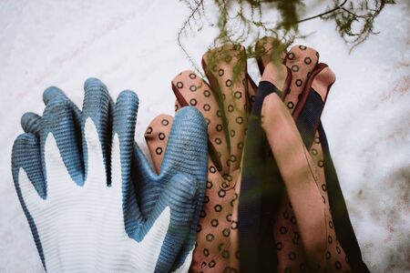 Hands in gloves planting a sprout in garden bed. Hands in colored gardening gloves. Place for text.