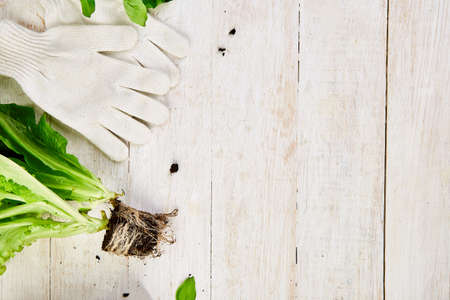 Flat lay of Gardening tools, basil, eco flowerpot, soil on white wooden background. Spring garden works concept. Layout with free text space captured from above.