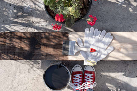 Painting a wooden board outdoors. Coated with protective oil against decay and moisture. paint brush and work gloves