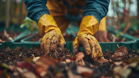Man gardener in rubber gloves composting food waste in backyard, Organic waste for compost, Eco-Friendly Gardening and Recycling concept. Generative ai.