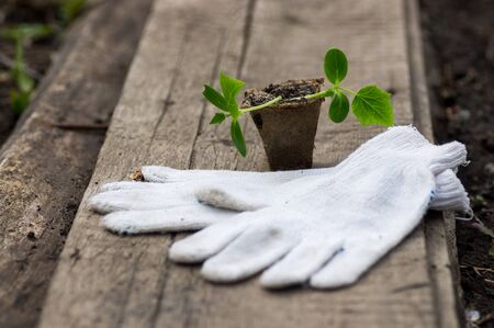 Plant a small sprout in a brown pot. Plant transplants. Military-style gloves.