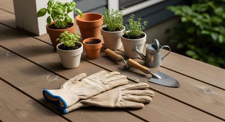 Gardening gloves, a trowel, a watering can, and potted herbs sit on a wooden deck, ready for planting. The composition represents spring gardening preparation, outdoor hobbies, and the cultivation of fresh home-grown plants.