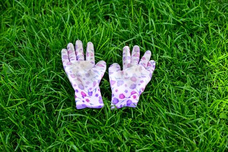 colorful garden gloves on a green grass.